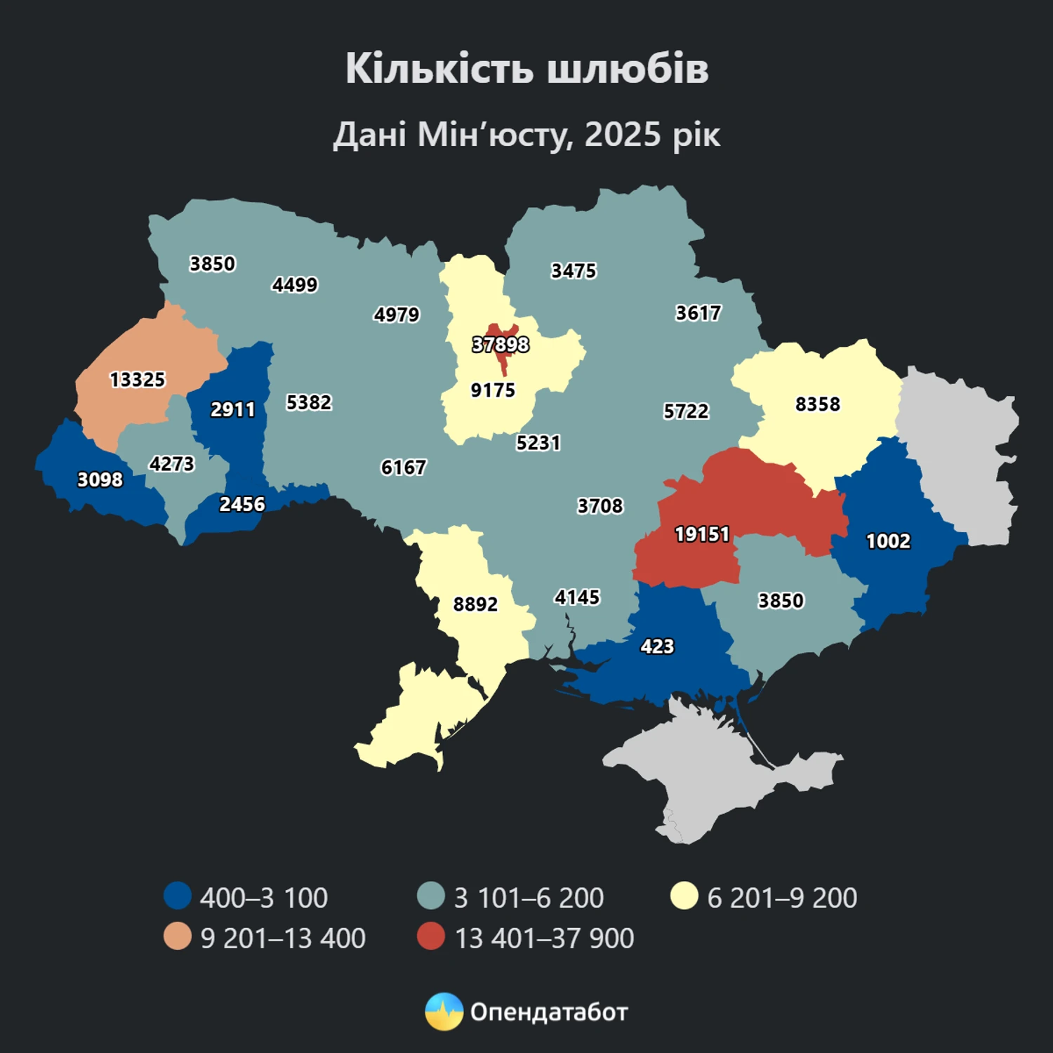 Для порівняння, у 2024 році кількість нових та розірваних шлюбів була майже однакова, а у 2021 році — 10 шлюбів на 6 розлучень.