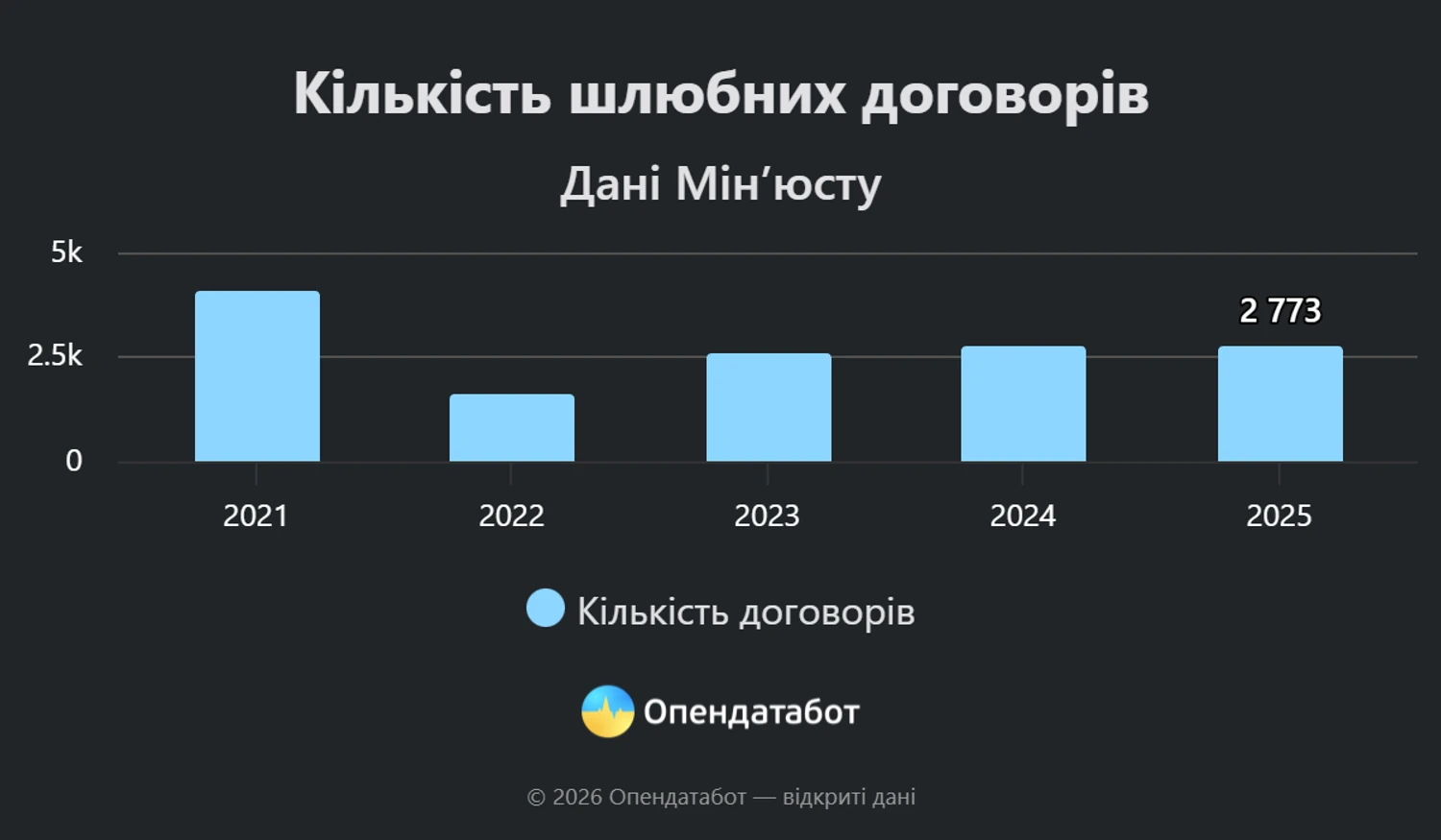 2 773 пари уклали торік шлюбні договори та засвідчили їх у нотаріусів. Це стільки ж, як й у 2024, однак на третину менше до 2021 року.