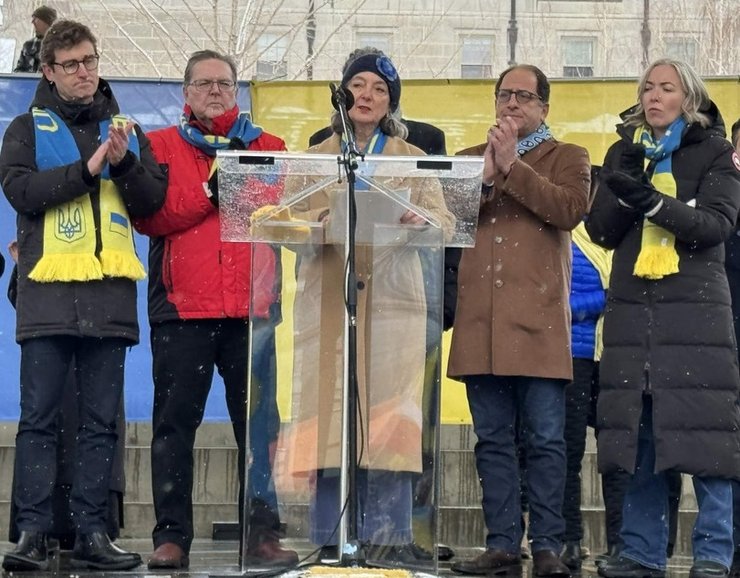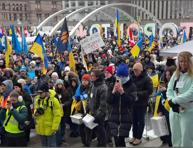 В Торонто 22 февраля на площади Nathan Phillips Square собрались тысячи украинцев на митинг, организованный Украинским конгрессом Канады — отделением в Торонто в рамках глобальной инициативы Global Rally for Ukraine. В мероприятии со словами поддержки приняли участие члены канадского парламента, мэр Торонто, а также генеральные консулы Франции, Ирландии, Германии, Чехии, Польши и Румынии. Чиновники со сцены заявили о дальнейшей поддержке украинского народа на пути к победе. Кроме политиков, выступил известный своим проектом "Взгляд с передовой" британский журналист Каолан Робертсон, который работает в Украине.