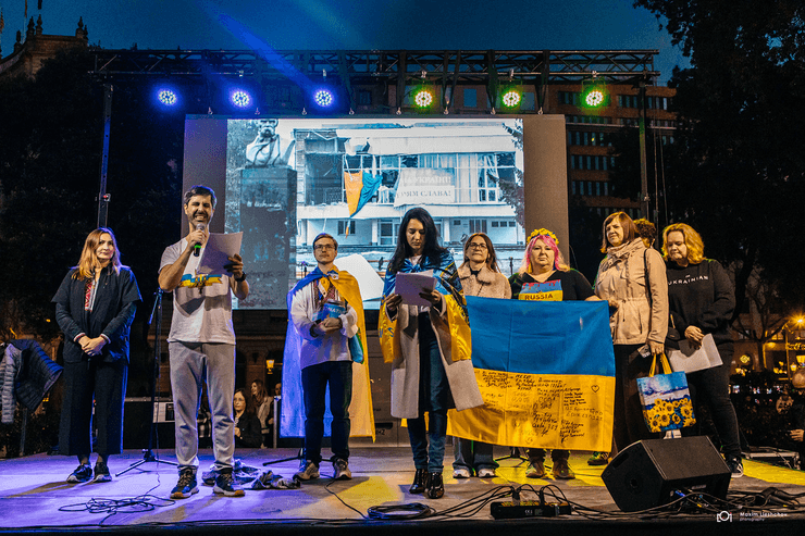 В этом году украинское сообщество Барселоны провело "Неделю Украины", в мероприятиях и обсуждениях могли принять участие иностранцы. Это были и показы фильмов, и встреча с украинской писательницей Оксаной Забужко, и благотворительный забег. В воскресенье в центре города состоялась большая манифестация, где со сцены звучали рассказы о зверствах, которые творит Россия в Украине, организаторы призвали помогать Украине оружием и усилить санкции о российской федерации. На выступлении присутствовали Председатель парламента Каталонии, Генеральный консул Украины в Барселоне, Директор представительства Европейской Комиссии в Барселоне и другие.